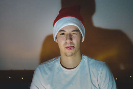 Teenager with a Christmas hat on his head grins funny. Unusual face from a person. The man blinks his eye and sticks out his tongue. Control of facial muscles.