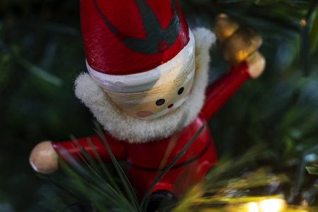 Cute santa claus toy hanging on tree, christmas background, decoration, celebration, greetings, copy space. macro shot.