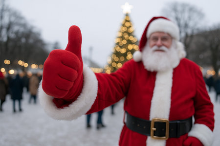 Santa claus giving a thumbs up gesture in a festive christmas market with beautifully lit tree in background during winter season celebration.