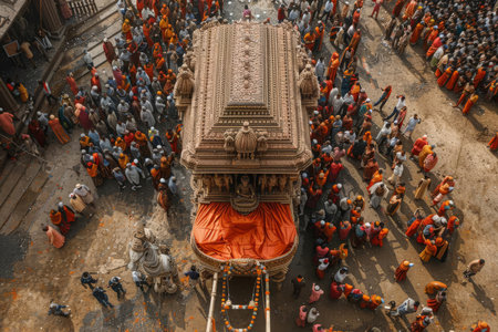 An aerial drone Rath Yatra, captured from above, showing intricate patterns formed by the crowd and chariot