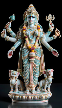 Goddess devi Durga idol decorated at a puja pandal in Kolkata, West Bengal, India. Durga Puja is one of the biggest religious festivals of Hinduism and is now celebrated worldwide.