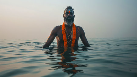 Serene Man with Sunglasses Swimming in Ocean during Sunset, Waist Up Portrait, Reflective Water Surface AI Generative