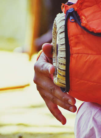 Musician playing a Thavil, a traditional Indian musical instrument in Hindu Wedding, Bangalore, Karnataka, India