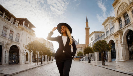 Traveler woman in white dress arms taking selfie self-portrait ooking over panoramic view of historic city of Mardin Turkey with mosque minarets and traditional houses and Mardin castle on hilltop