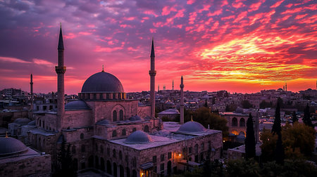 A breathtaking view of a mosque in Istanbul at sunset, with vibrant colors in the sky.