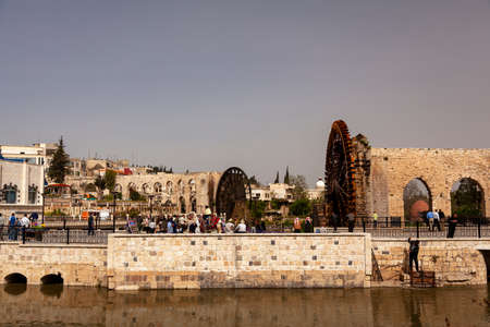 Hama Syria 04-02-2010: Cityscape of Hama with Orontes River and famous Norias (waterwheels) built to deliver water from river to historic aqueducts for irrigation. This is a tourist destination.