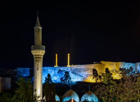 Landmarks of Sanliurfa city such as Urfa Castle also minaret and domes of Rizvaniye mosques in Golbasi Park,Sanliurfa.Turkey.