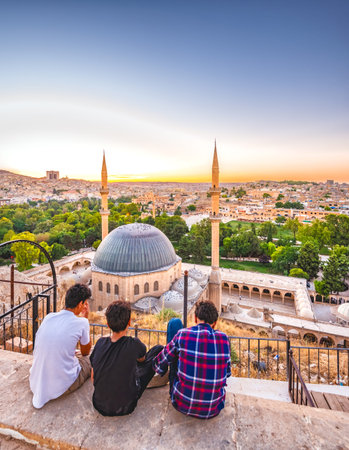 Unidentified people look over Mevlidi Halil Mosque,one of landmarks in Sanliurfa,Turkey.18 July 2018