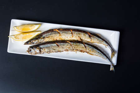 Grilled Capelin Fish or Saury Fish with Lime served in plate isolated on orange background side view of hong kong food