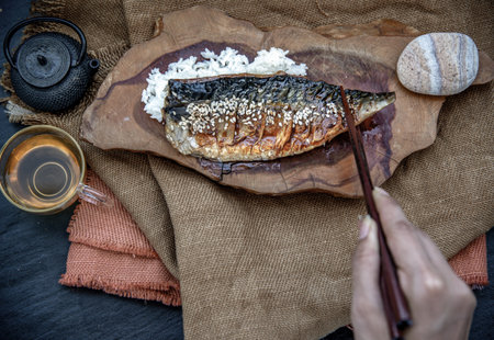 Japanese meal for dinner saba fish grilled on rice with teriyaki sauce on a wooden background served with hot tea. Japanese style, Oblique view from the top.