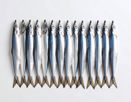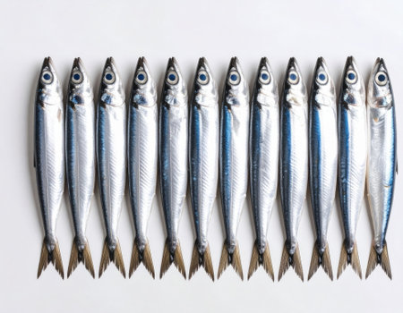 Sardines in a row on a white background, top view