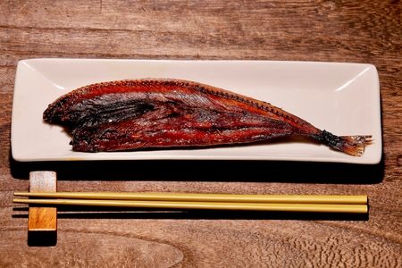 Dried fish on wooden Japanese place mat