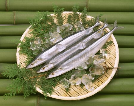 Saury fish on wooden board