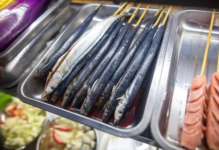 Grilled fish on wooden sticks. A dish of Chinese cuisine.