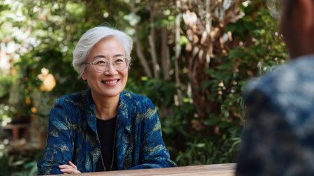 A woman with short gray hair smiles warmly while sitting at a wooden table in a lush garden. Sunlight filters through the plants.