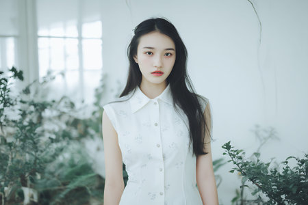 A young woman with long, dark hair and a white dress stands in front of a blurred background of greenery and windows. She is looking directly at the camera with a neutral expression. The image appears to be a portrait, possibly for a fashion or beauty shoot.