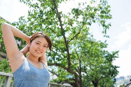 Asian woman jogging in the city.