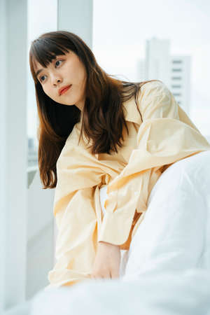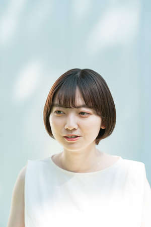 A serious face of Japanese young woman behind the white wall in the room