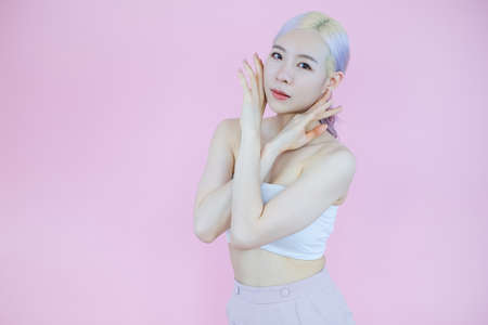 posing beautiful asian woman posing on pink background, emotions action, beauty concept