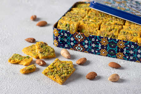 Traditional Persian dessert Sohan from Iran in box on gray background.