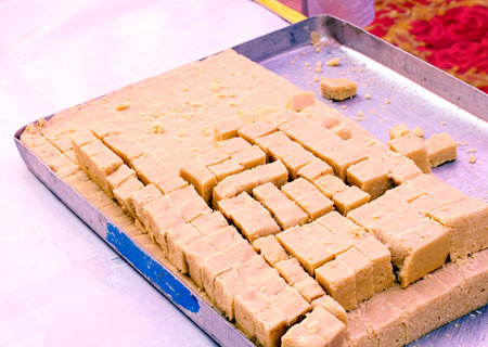 traditional Indian sweets, Mawa barfi decorated in a tray at an Indian wedding