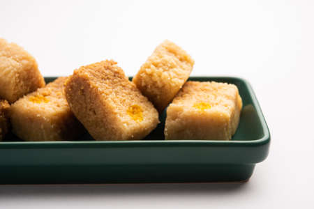 Mysore pak is an Indian sweet prepared in ghee. It originated in the city of Mysuru