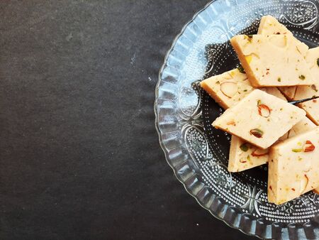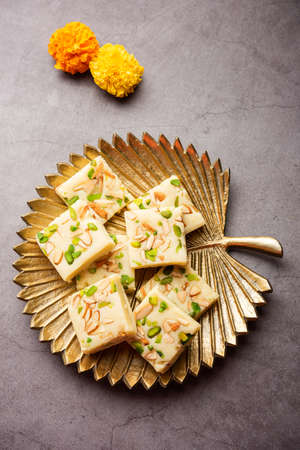 Milk powder barfi also known as Mava burfi, white Khoya burfi or Barfee, Indian Sweet food