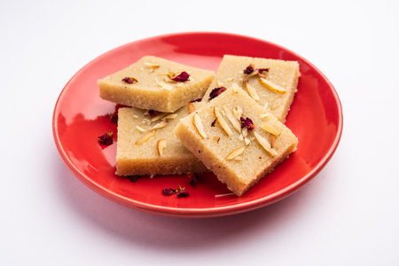 Rava barfi or sooji burfi or barfee is an Indian Sweet made with semolina, sugar, ghee and almonds