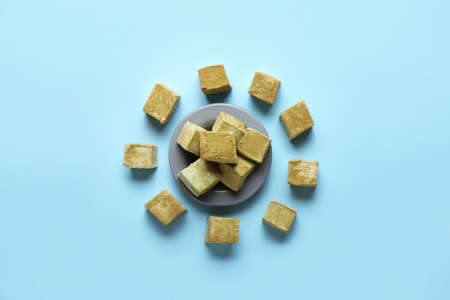 Plate with tasty hojicha marshmallows on blue background