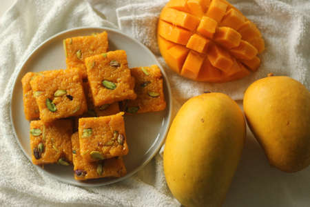 Mango fudge or Mango barfi or Mango kalakand. A mango version of Indian sweet dish Kalakand. A grainy textured Indian sweet dish with milk, lime juice, vinegar and sugar. Prepared with alphonso mango