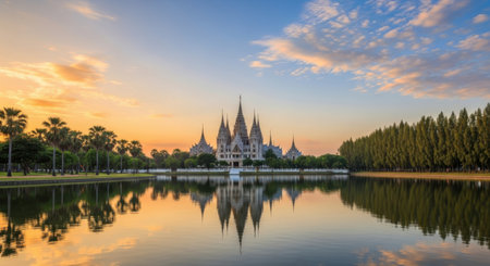 A majestic temple with intricate spiers is reflected beautifully in a calm lake during a vibrant sunset.