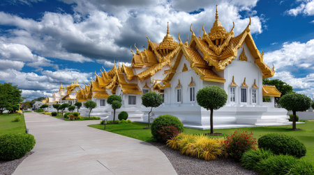 This stunning image showcases a grand Thai palace framed by lush greenery, with a bright blue sky adorned with cloud formations, reflecting cultural beauty and serene atmosphere.