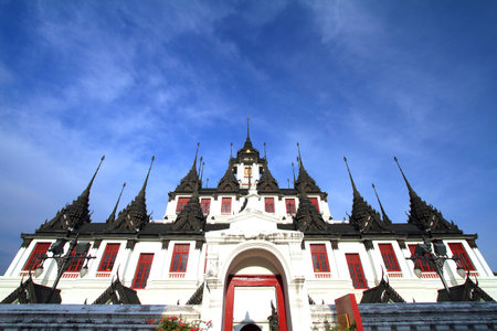 Loha Prasat at Wat Ratchanadda under a bright sunlight and clear blue sky, Bangkok Thailand