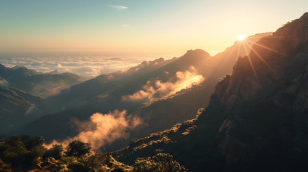 Experience the calm beauty of layered mountains enveloped in mist during sunrise. This enchanting landscape captures nature's tranquility and captivating scenery.