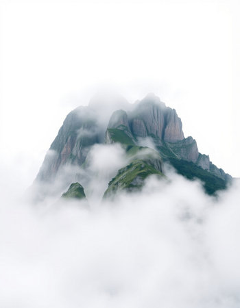 Misty mountain landscape soft fog hues embracing towering peaks in nature s serenity