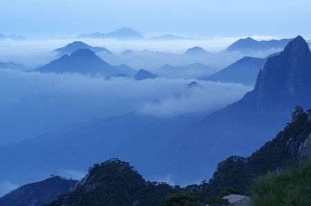 Huangshan mountain peaks with trees in China, Sacred Yellow Mountain