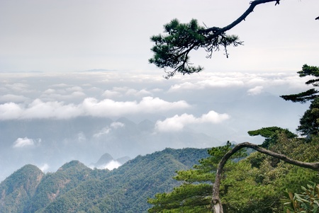 View of the clouds and the pine tree at the mountain peaks of Huangshan National park, China. Landscape of Mount Huangshan of the winter season.