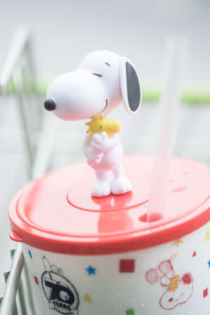 Samut Prakan, Thailand - August 18, 2020 : Celebrating 70 years of Chester's X Snoopy, a snoopy mug with drinks is only 129 baht from Chester's Grill restaurant its unique flavor of grilled chicken at