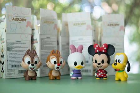 Samut Prakan , Thailand - April 25, 2021 : Figurine donald duc, chip (Tic) and Minnie Mouse, Mickey mouse family figures mystery box blind box from Miniso sell in Thailand