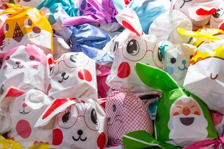 Multicolored bags, with animal motifs, in the style of Japanese anime. Fortune cookie