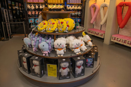 Interior view of BT21 store on Broadway in New York with shelves of plush toys for sale. New York, USA. 09.22.2022.
