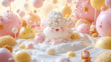 Playful and colorful collection of children's bath bombs shaped like cute animals and stars, floating in water with bubbles. Concept of fun, kids hygiene, bath time, and cheerful bath products.