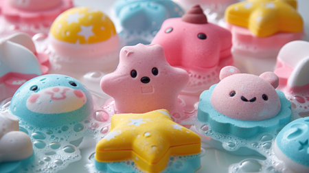 Playful and whimsical bath bombs in star, heart, and animal shapes. Funny and colorful bath accessories for kids. Concept of fun, kids hygiene, and cheerful bath products.
