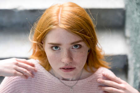 Red-haired girl standing on the stairs and looking at the camera. Redhead. Jeans.