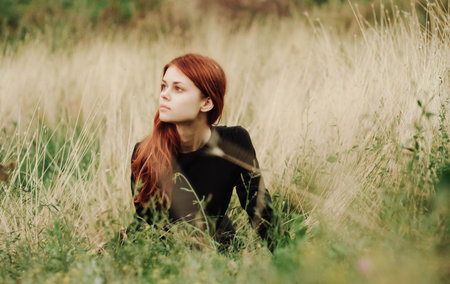 Romantic woman with red hair lying in the grass in the woods. A girl in a light black dress sleeps and dreams in a magical forest
