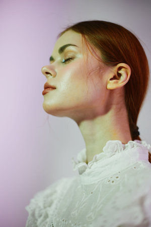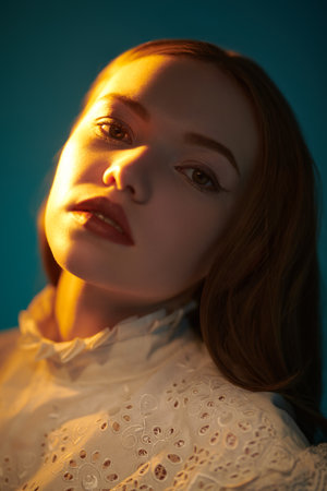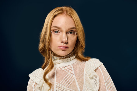 Ethereal portrait of a young woman with red hair in vintage lace blouse, expressing calmness and serenity against a softly lit pastel background