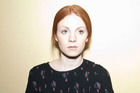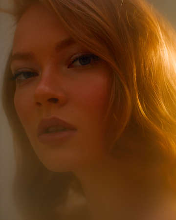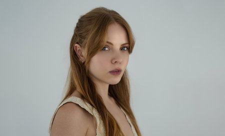 Redhead young beautiful girl with perfect skin and pretty face, close up studio portrait of sensual ginger female