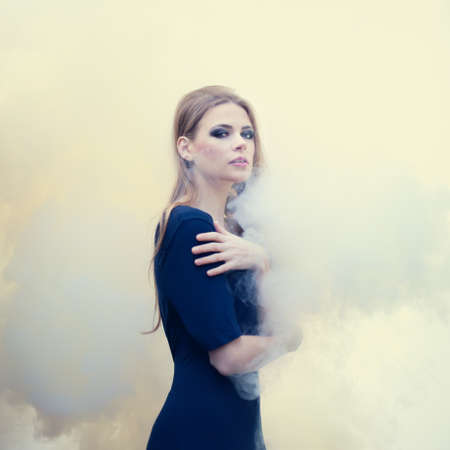 sensual beautiful girl in white smoke on nature