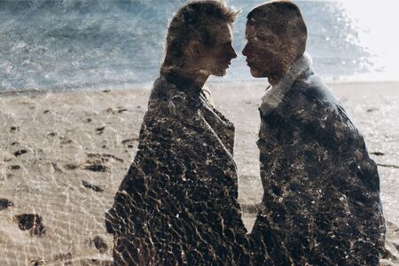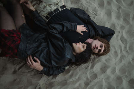 Informal lovers are cuddling indoors on beach at the evening while laying near each other