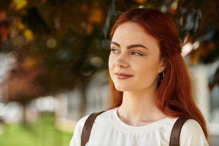 A young woman with striking red hair enjoys a tranquil moment outside, surrounded by greenery.